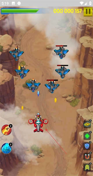 继续游戏进程,遭遇数架蓝色敌方战机,控制己方飞机灵活移动,发射子弹对其展开攻击,与此同时收集场景里的金币,以此累积游戏分数。