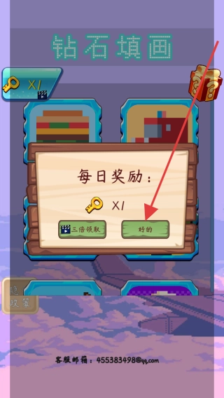 进入游戏钻石填画界面后,点击“好的”按钮,领取每日奖励,开启游戏的冒险挑战,随后进入游戏主场景。