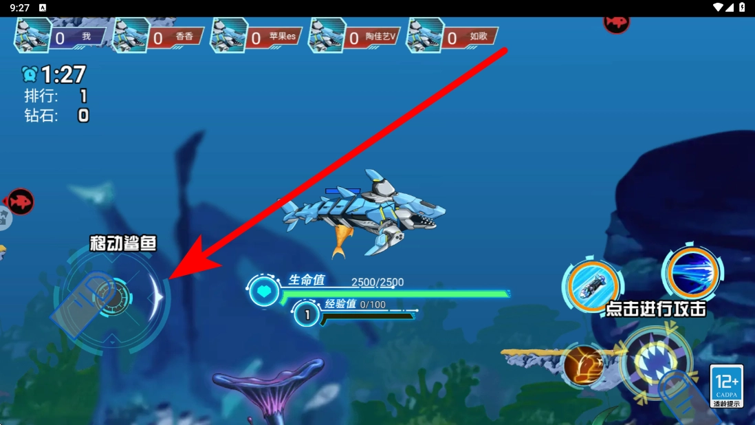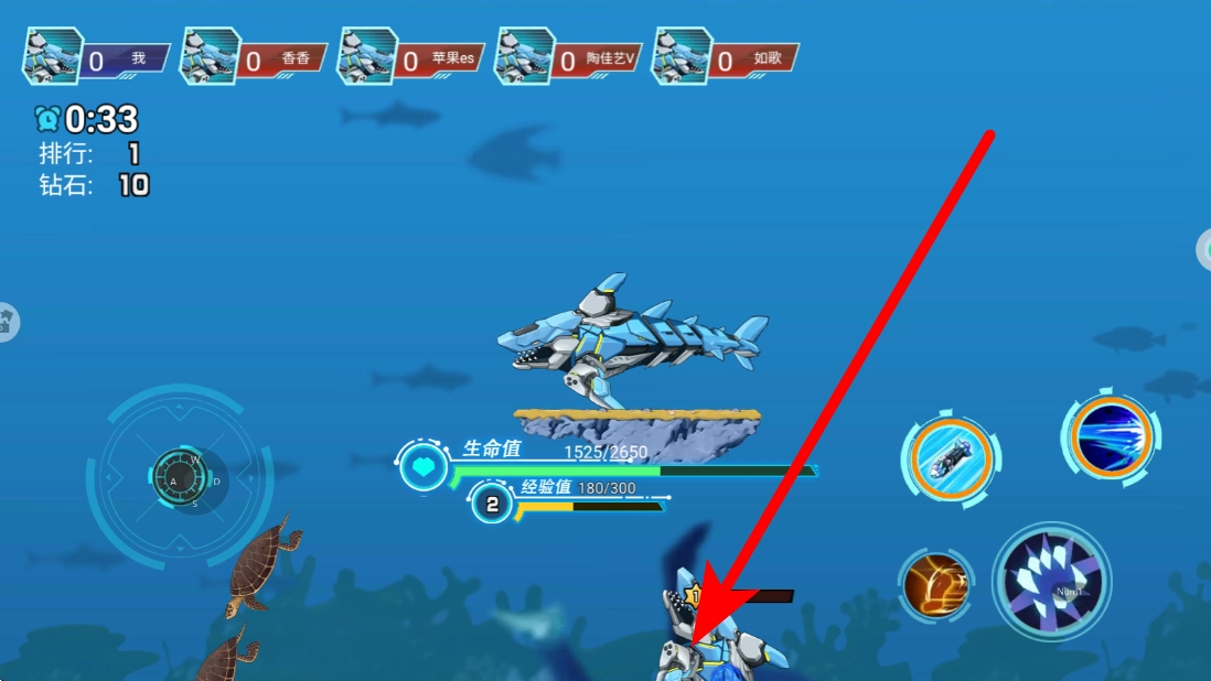 进入应用,进入战斗界面后,借助左侧的操作区域来控制机甲鲨鱼的移动,灵活地调整其位置,以便更好地应对战场上的各种情况,同时寻找恰当的战斗时机。