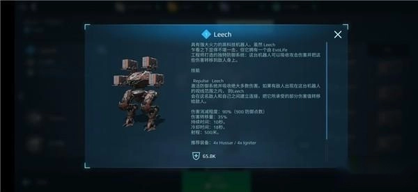 最后划重点——水蛭的技能机制相当棘手,冷却时间还短,具体效果可以参考图示。它最核心的优势在于开启技能后能获得90%的伤害减免,同时会将35%的伤害反弹给被链接的目标对手。武器配置这块,说难不难、说简单也不简单:中低端局里,把四个中加特林(就是攻击距离500的那款)升到九级基本够用,但它有个明显短板——血量偏低(更适合中高端局使用)。另外最近要推出蝎子,这玩意机制也很“恶心”,尤其克制这类依赖技能的机器人,具体细节我就不提前透露了,毕竟数值还有调整的可能。以上就是我的全部推荐内容啦。