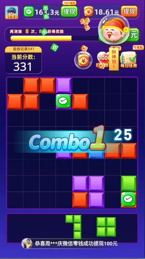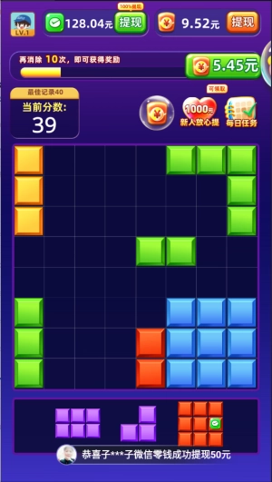 鸿运消砖块是一款玩法类似俄罗斯方块的红包消除小游戏。在游戏里,你要把各种形状各异的方块填充到格子中,只要凑满一行或者一列就能消除并获取红包奖励。当消除达到一定次数时,还能得到额外的红包福利呢!这款游戏玩法十分简单,而且福利丰厚,要是心动了就快来体验一番吧!