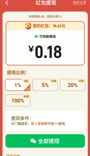 你积累的所有红包都能按一定比例提现,而且这个提现比例还可以通过升级来提高。