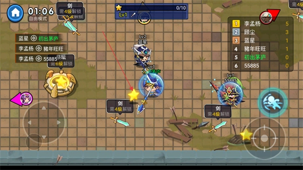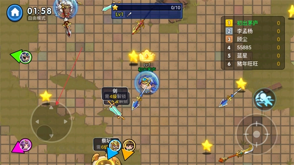 控制角色进行移动,收集场景里的剑等武器来提高等级,与此同时要避开敌人的攻击。