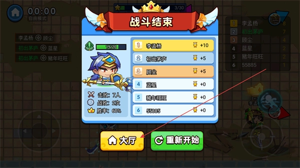 战斗结束后查看排名,点击重新开始开启新一轮对战。