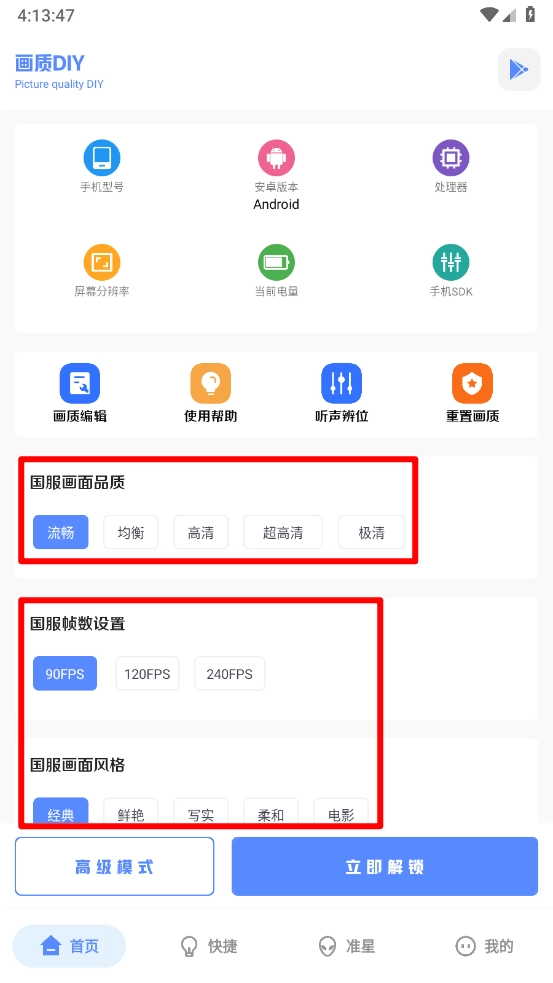 2、进入首页后,依据自身手机的配置情况,挑选适配的画质与音质进行调整。