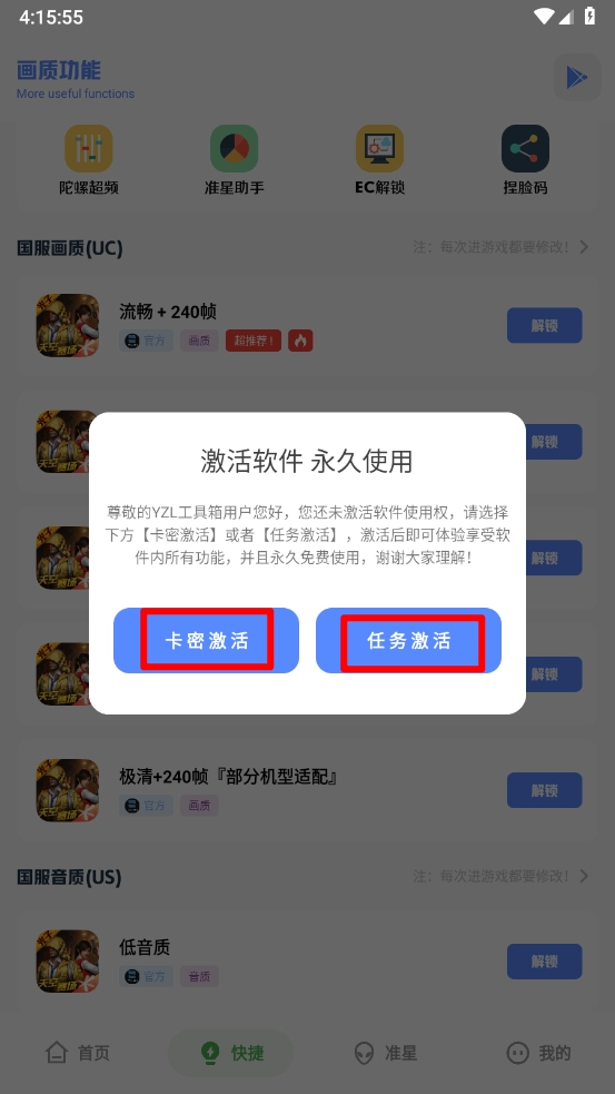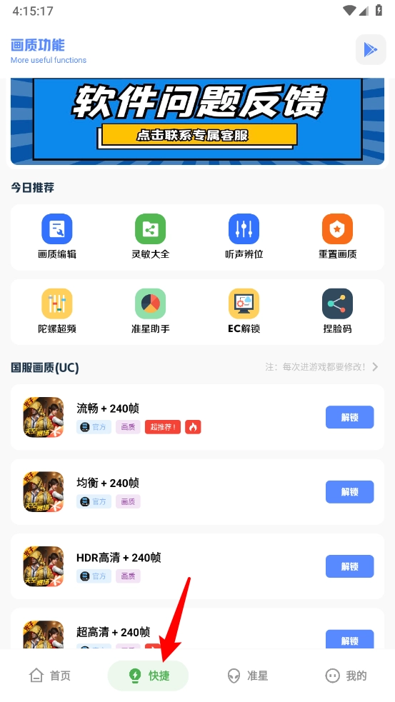 4、切换至"快捷"板块,可以选择对应的画质、音质进行解锁。