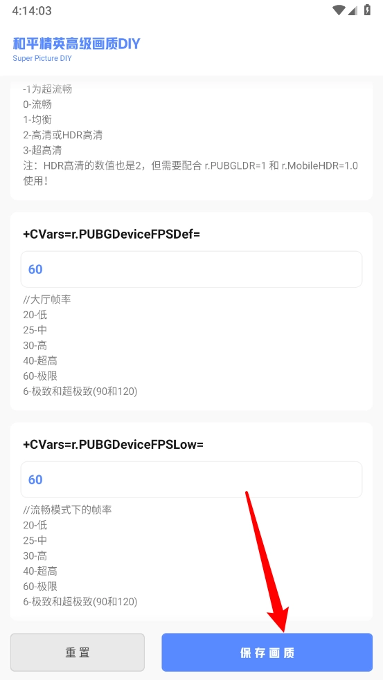 3、也能点击“高级画质”进入,依据实际需求设置对应的帧率和流畅度,设置完成后点击“保存画质”即可。