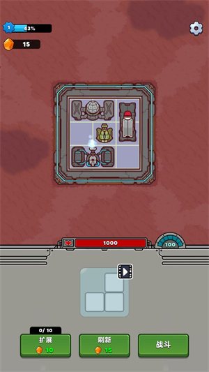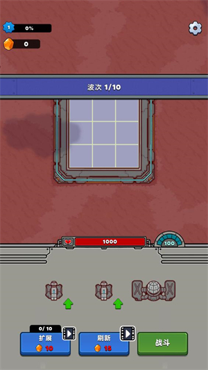6、一波战斗结束后玩家会进入休整状态,你可以点击刷新按钮获取新的炮塔,也可以点击扩展按钮来扩大自己的基地范围。