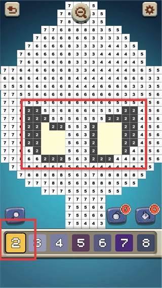 进入涂色关卡后,点击顶部的放大镜按钮可以放大涂色区域,接着查看底部的数字键,选择【1】就能开始填充对应的区域啦。