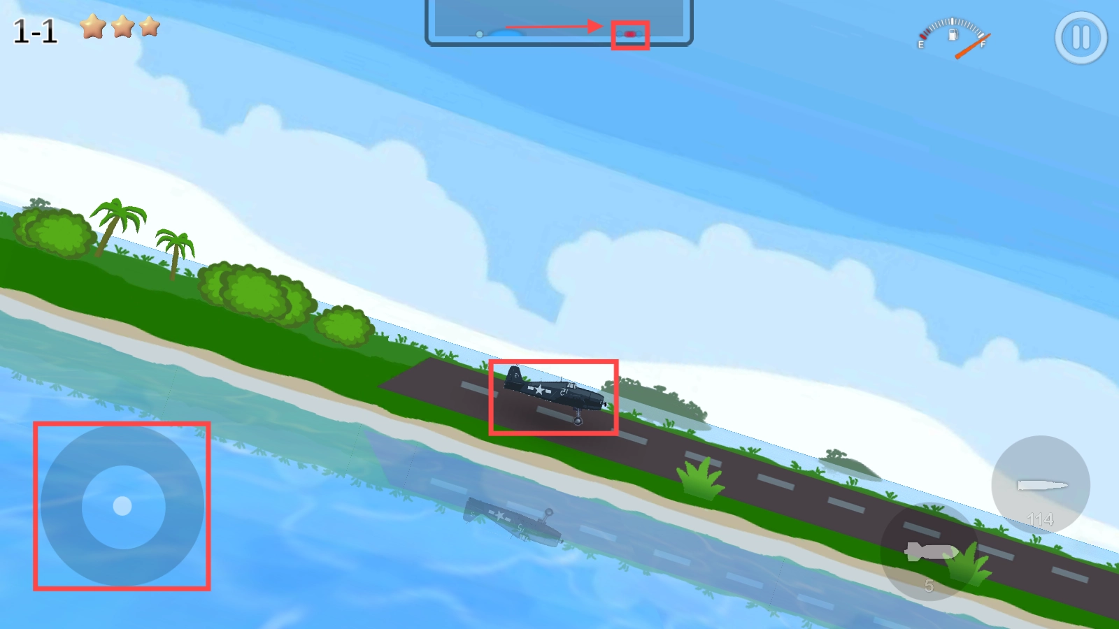 在关卡中,通过左侧的圆盘来控制飞机的移动方向,引导飞机顺着跑道滑行,为起飞执行任务做好准备。