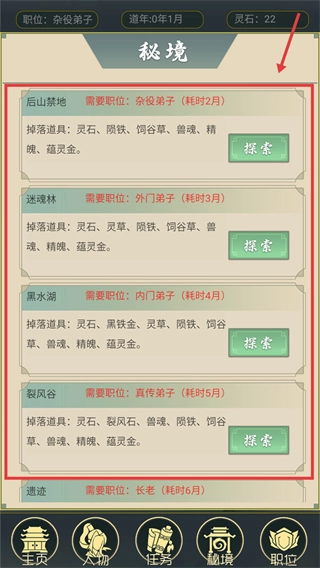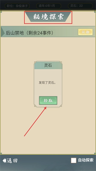在【秘境探索】的【后山禁地】里,手动探索时若发现灵石请及时拾取,以此积累资源来提升自身修为。