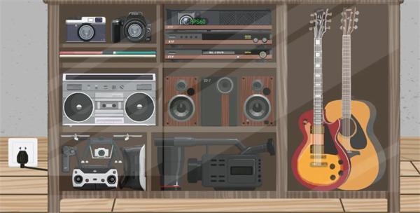 唱片得先装进袋子里,才能放入柜子中;两根小棍子要放在手柄上方,之后将手柄放进柜子,放好后别忘关上玻璃门再插上电源。最后所有物品的摆放位置都和图里显示的一样。