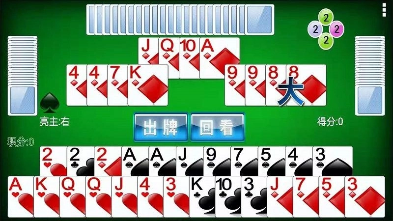 在单机模式下,尽管对手是电脑,玩家依然需要和电脑队友配合默契,借助出牌的先后顺序以及花色的选择来传递信息,一起规划战术。