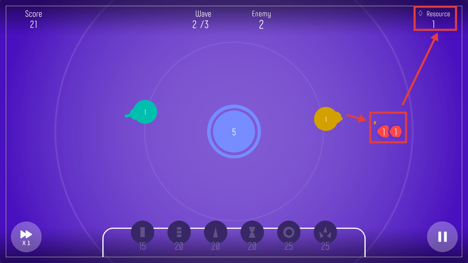 3、在战斗中,消灭敌人可以获取【Resource】,注意收集,积累资源强化炮塔呀。