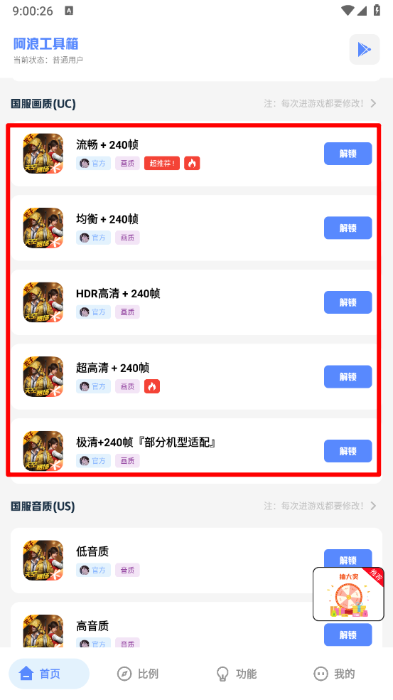 5、切换到“比例”板块,用户可依据自身需求挑选比例模式,点击“解锁”按钮就能调整游戏视野。