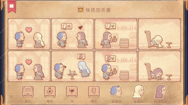 第七个格子里放着“毒药+埃德加”,埃德加决意要为蕾诺拉报仇,便往伊泽贝尔的酒杯里投了毒。