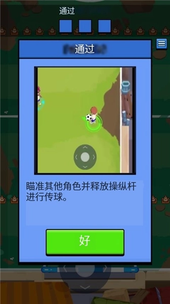 第三关的规则是,你要瞄准其他角色,然后松开操纵杆来传球,只要传球次数达到三次及以上,就算闯关成功啦。