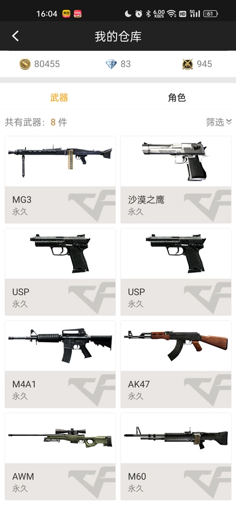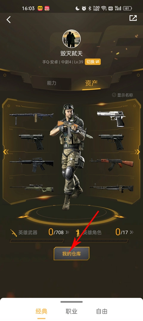 4、点击“我的仓库”,就能查看倒酒游戏里所有的道具和武器。