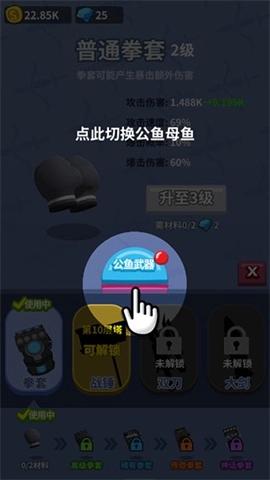 在武器界面中,玩家能够切换公鱼与母鱼的装备,还可以对装备开展升级操作。