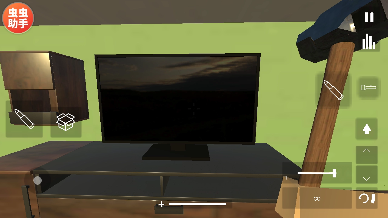 4、进入游戏,你会发现自己处在屋内,手里拿着锤子,不多说,先开锤,把这个电视机锤烂!