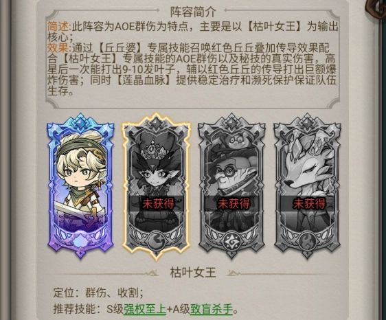 阵容简介:此阵容为AOE群伤为特点,主要是以【枯叶女王】为输出核心。