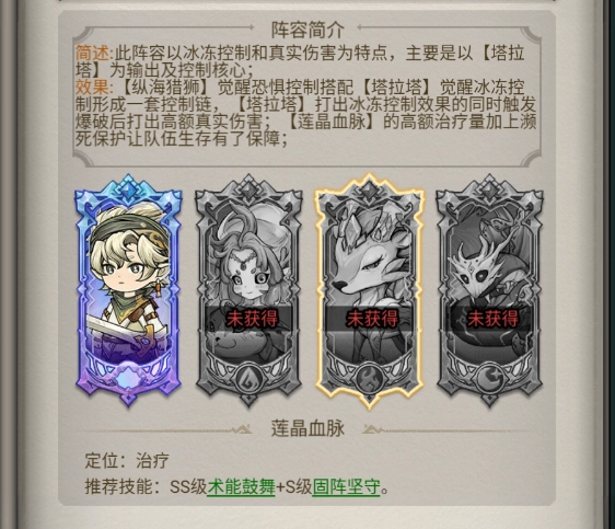 阵容效果:【纵海猎狮】觉醒恐惧控制搭配【塔拉塔】觉醒冰冻控制形成一套控制链,【塔拉塔】打出冰冻控制效果的同时触发爆破后打出高额真实伤害;【莲晶血脉】的高额治疗量加上濒死保护让队伍生存有了保障。