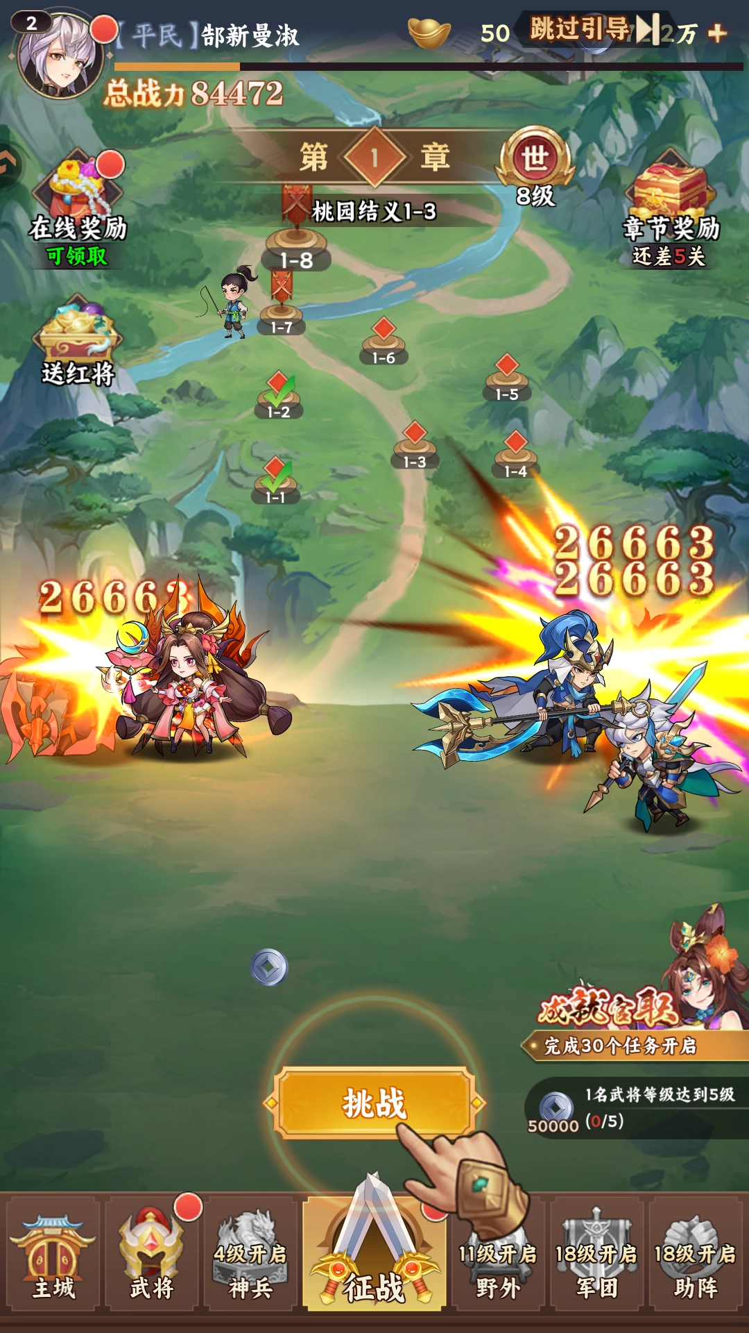 升级:消耗粮草可提升武将等级,使其基础属性得到增强。建议优先提升主力阵容的武将等级。