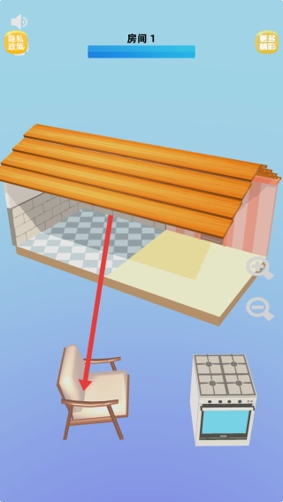 注意观察房间1的进度条,按照提示把剩下的物品整理好,保证每一件家具都摆放在箭头所指的位置,顺利完成这次收纳任务。
