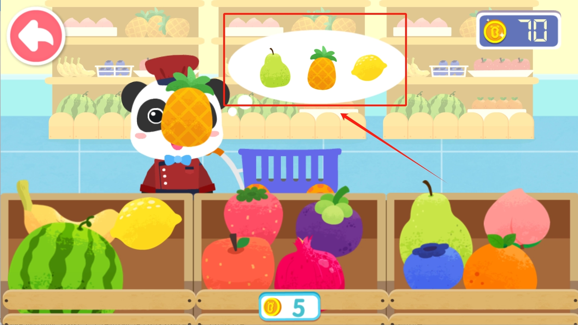 2、选定超市后,我们就着手制作第一道美食——美味的果汁。先选购水果,接着让宝宝依据图示的要求挑选对应的水果。