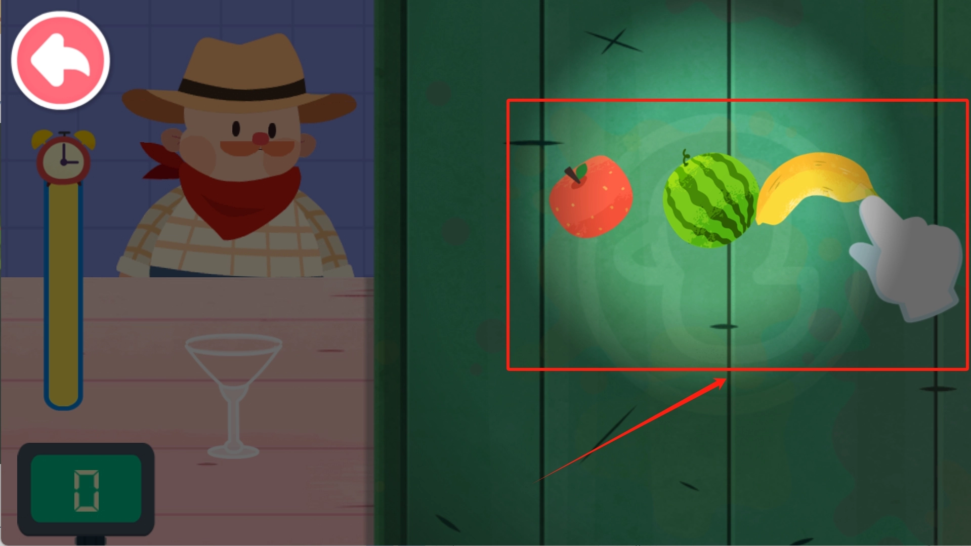 4、点击“切水果”选项后,就能进入切水果游戏界面。游戏中每成功切开一个水果都会获得果汁,当左侧的杯子被果汁装满时,就可以将这杯果汁提供给顾客享用了。