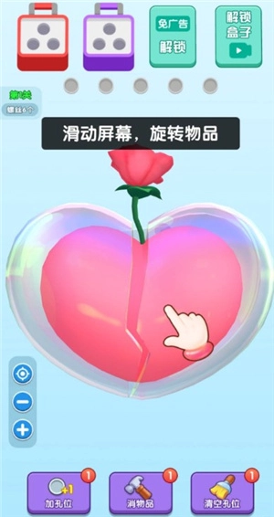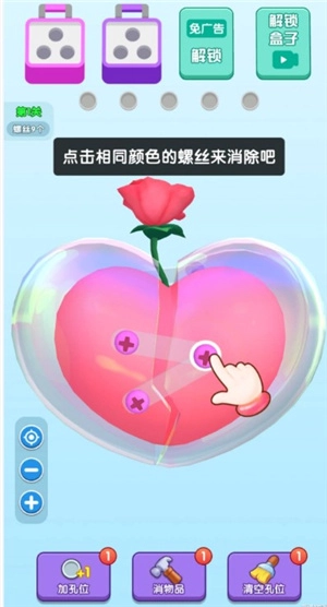 这时候也会出现一个新盒子,要是螺丝都消除了自然就过关了。