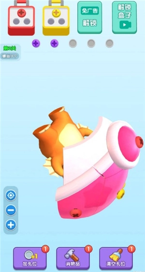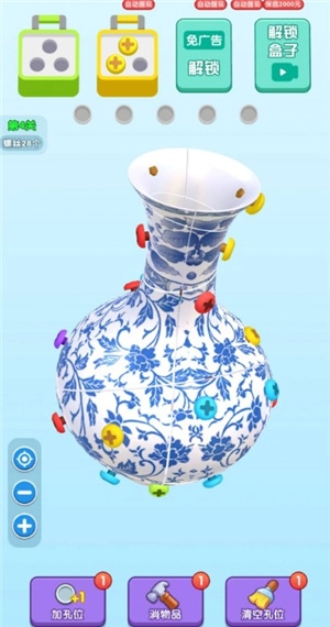 眼神真不错,这是个挺有意思的解螺丝闯关小游戏。玩家需要把关卡里的螺丝都拧下来,就能顺利通关拿红包。底部还配备了三个实用道具,用了之后能更快解开螺丝,收获的大量红包都可以自由兑换。