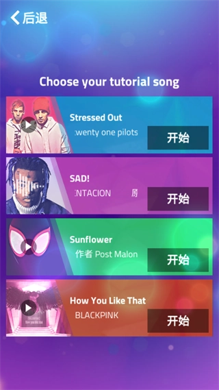 进入歌曲界面后,点击黑色方块上的“开始”按钮,游戏便正式启动。你需要依次点击或长按屏幕上出现的方块,若在显示的线条位置进行点击,就能获取更高的分数。