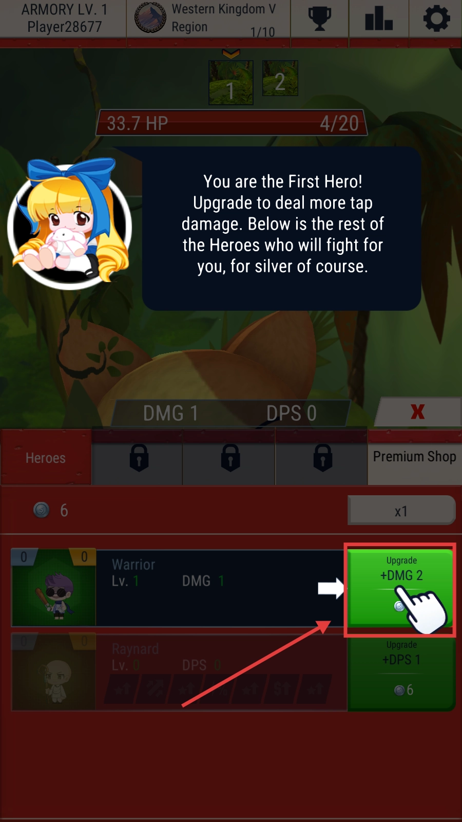 积累银币后,点击【Upgrade】按钮升级勇士,这样能提升他们的攻击伤害,更好地助力战斗推进哦。