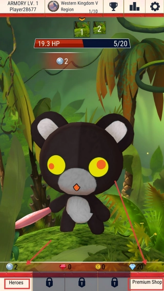 借助下面的资源与商店,点击【Heroes】或【PremiumShop】,解锁相关功能来武装自己,把外星宠物全都赶跑。