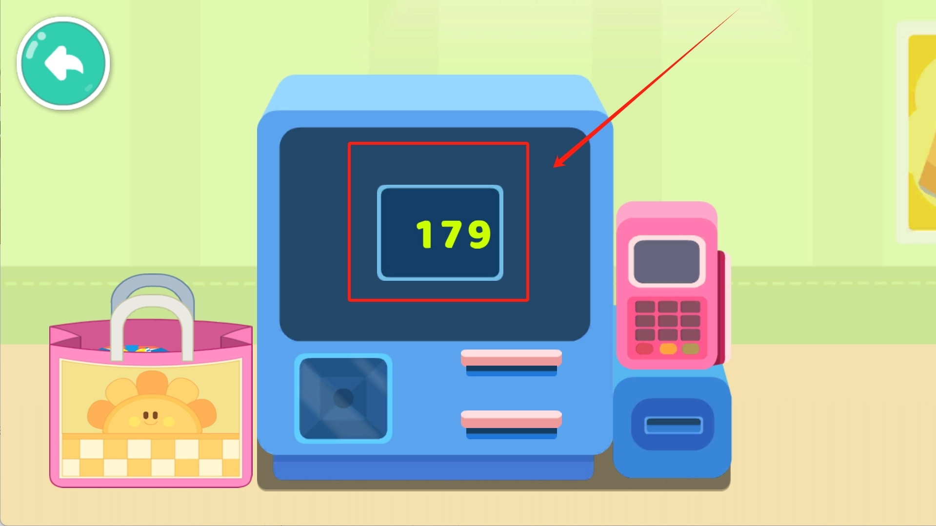 3、收银台结算:将选购的商品放在传送带上,系统会自动计算总价。孩子需要输入付款金额,并计算出正确的找零数目。