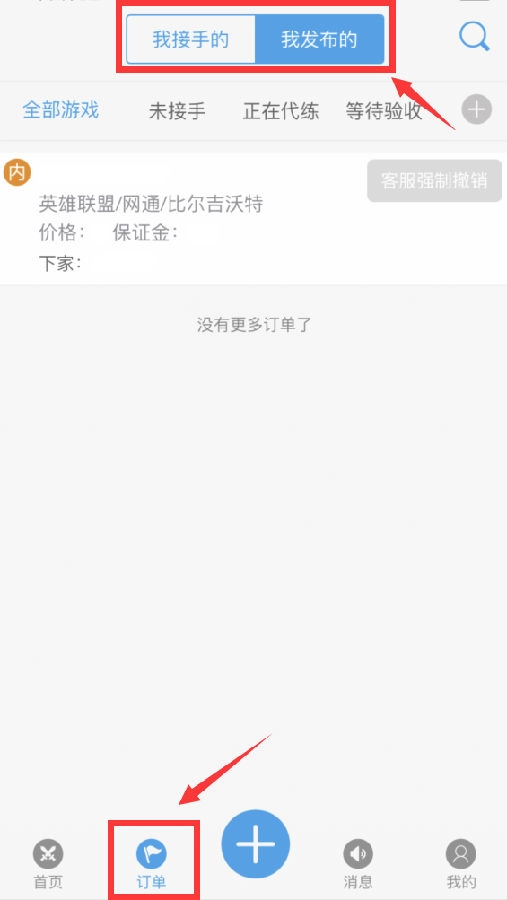 6、点击“我的”查看接手订单,获取账号密码后开始代练(LOL订单需通过电脑客户端自动输入账号密码登录)。