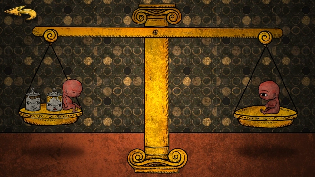 游戏里不少解密环节与剧情的关联设计得颇为巧妙:像鱼头教祭祀前的仪式中,水晶球的排列方向既是一道谜题,也暗喻了祭祀终将失败;而天平平衡的解密,则隐晦地透露了主角单眼哥哥在家庭中不受重视的处境。