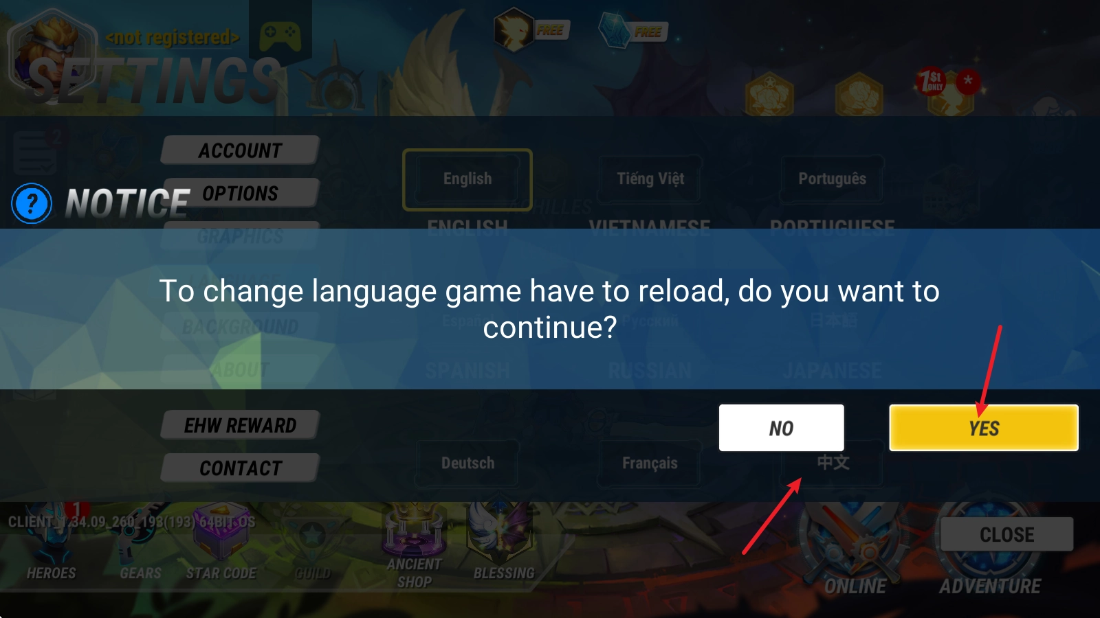3、随后点击中文后,选择yes确认,之后重启游戏后即可切换。