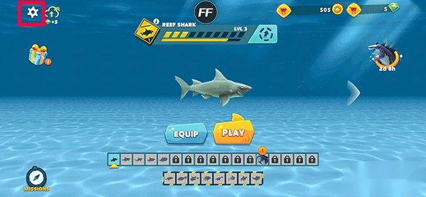 1、启动游戏《饥饿的鲨鱼进化》,在游戏主界面中找到并点击左上角的“齿轮”形状的设置按钮;