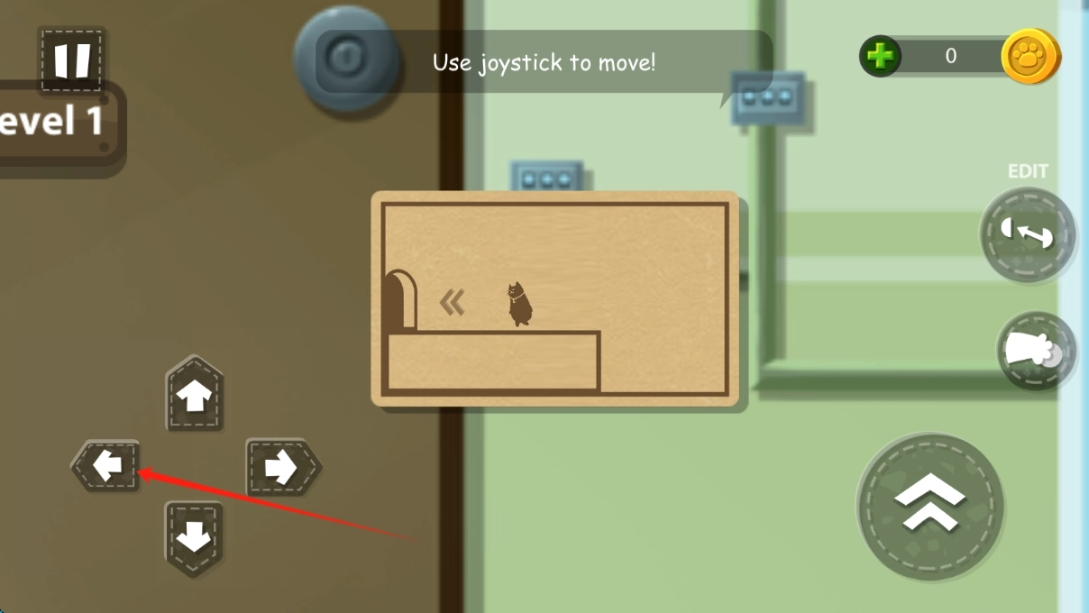 通过左下角的摇杆来操控猫咪的移动方向,当向左操作摇杆时,猫咪会在木板搭建的场景里进行探索,逐步靠近那些关键的区域。