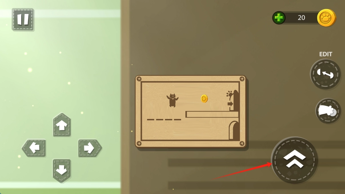 在下方的木板场景里,点击右侧的箭头按钮,帮助猫咪越过障碍,收集金币并到达目标位置。