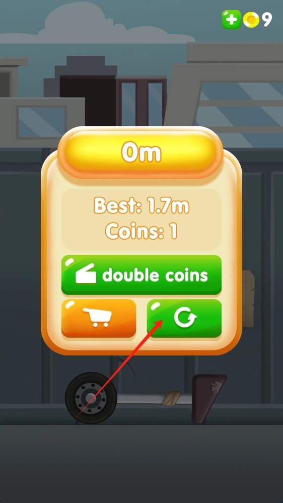 游戏结束后,在结算界面查看最佳得分和金币数量,点击绿色按钮即可重新开始游戏,持续挑战自我,刷新最佳得分记录。