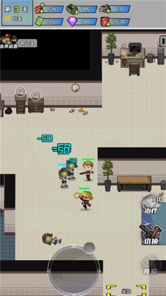 在游戏场景里要留意第3天、白天这类时间信息以及资源数值,操控角色借助治疗、切换等按钮和僵尸对抗,同时关注击杀进度。