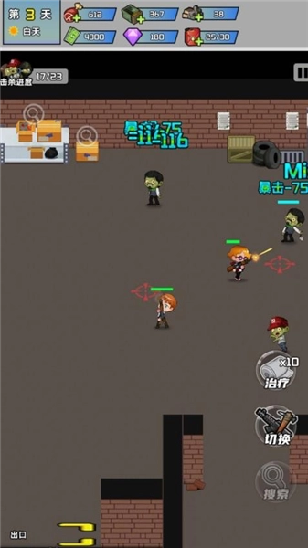 在后续的战斗进程里,留意角色攻击时显示的伤害数值(例如-75)以及暴击相关的提示信息(比如暴击-75),并通过合理的移动来避开僵尸的攻击。
