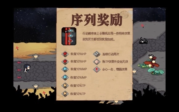然后进入下一个场景会进入第一场战斗,并获得初始武器——村里最好的水管和一件衣服并装备(别想着脱衣服人物贴图也会变这样的小聪明噢)同时附上新手教程如下,至此游戏所有新手导引元素结束。战斗具体不难,依靠方向键切换轮盘选择行动方式即可,攻击就是老老实实打一下,牵扯魔法和治疗的术式和特技会在以后解锁,分别消耗人物的MP(蓝槽)和TP(黄槽),顾名思义,后者可以通过受击和攻击回复。