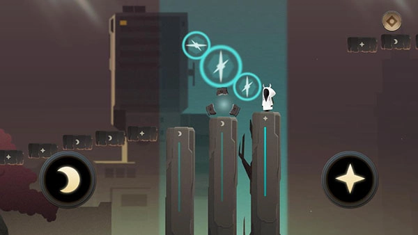 城市灯光散落,黑暗中出现噩梦,她为振兴城市追求正在消失的东西,梦中火焰是恐惧和噩梦并吞噬梦幻世界,点击屏幕星星和月亮图标让光线追踪者向前跳跃。