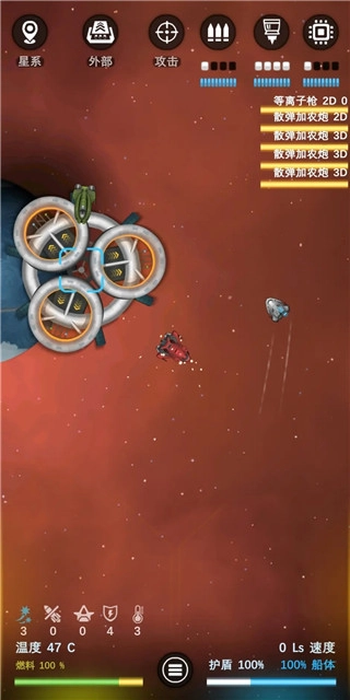 1、自动攻击:点击攻击显示武器系统然后选择一个目标,最后点击自动驾驶。
