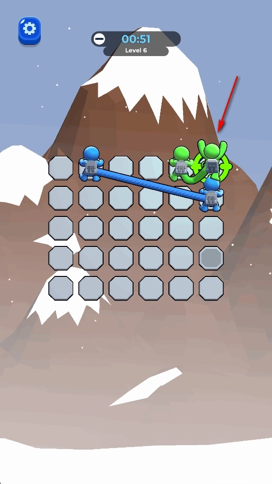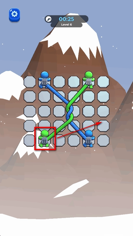 还剩下绿色和蓝色两根绳索,按照缠绕的方向把图中的绿色小人移到左边,就能解开一个结。
