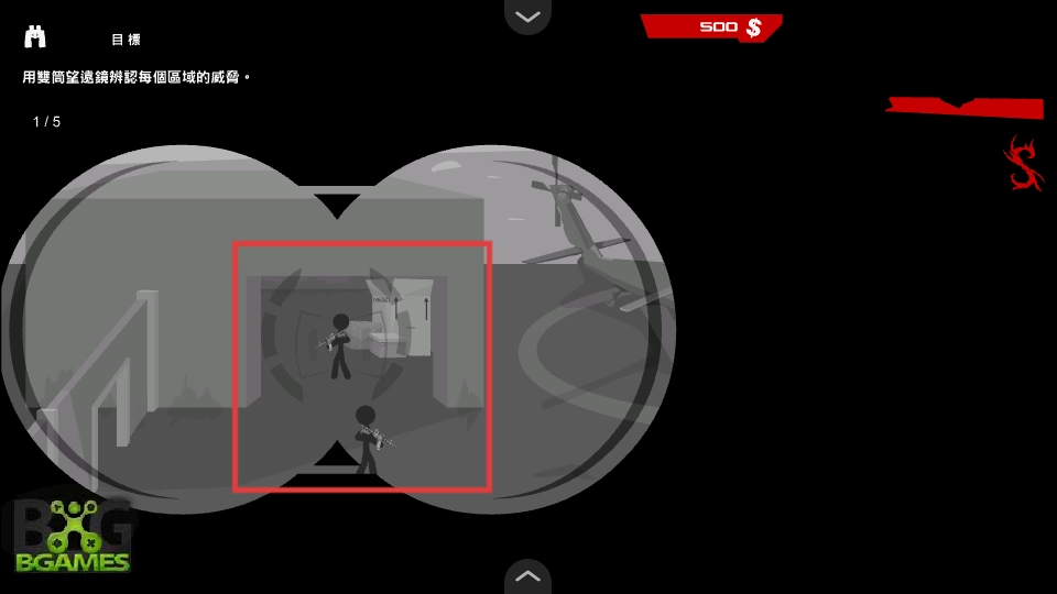3、使用双筒望远镜,辨认场景中每个区域的威胁,为后续行动做准备。